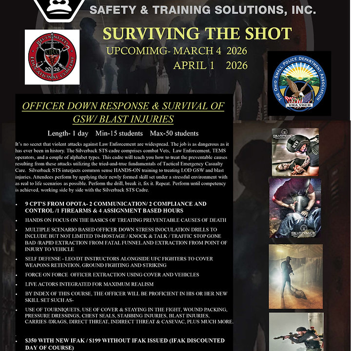 OFFICER DOWN RESPONSE & SURVIVAL OF GSW/ BLAST INJURIES Length- 1 day Min-15 students Max-50 students It’s no secret that violent attacks against Law Enforcement are widespread. The job is as dangerous as it has ever been in history. The Silverback STS cadre comprises combat Vets, Law Enforcement, TEMS operators, and a couple of alphabet types. This cadre will teach you how to treat the preventable causes resulting from these attacks utilizing the tried-and-true fundamentals of Tactical Emergency Casualty Care. Silverback STS interjects common sense HANDS-ON training to treating LOD GSW and blast injuries. Attendees perform by applying their newly formed skill set under a stressful environment with as real to life scenarios as possible. Perform the drill, break it, fix it. Repeat. Perform until competency is achieved, working side by side with the Silverback STS Cadre. 9 CPT'S FROM OPOTA- 2 COMMUNICATION/ 2 COMPLIANCE AND CONTROL /1 FIREARMS & 4 ASSIGNMENT BASED HOURS www.silverbacksafety.com 740 252 2956 troy@silverbacksafety.com HANDS ON FOCUS ON THE BASICS OF TREATING PREVENTABLE CAUSES OF DEATH MULTIPLE SCENARIO BASED OFFICER DOWN STRESS INOCULATION DRILLS TO INCLUDE BUT NOT LIMITED T0-HOSTAGE / KNOCK & TALK / TRAFFIC STOP GONE BAD /RAPID EXTRACTION FROM FATAL FUNNEL AND EXTRACTION FROM POINT OF INJURY TO VEHICLE SELF DEFENSE - LEO/DT INSTRUCTORS ALONGSIDE UFC FIGHTERS TO COVER WEAPONS RETENTION, GROUND FIGHTING AND STRIKING FORCE ON FORCE OFFICER EXTRACTION USING COVER AND VEHICLES LIVE ACTORS INTEGRATED FOR MAXIMUM REALISM BY INDEX OF THIS COURSE, THE OFFICER WILL BE PROFICIENT IN HIS OR HER NEW SKILL SET SUCH AS- USE OF TOURNIQUETS, USE OF COVER & STAYING IN THE FIGHT, WOUND PACKING, PRESSURE DRESSINGS, CHEST SEALS, STABBING INJURIES, BLAST INJURIES, CARRIES /DRAGS, DIRECT THREAT, INDIRECT THREAT & CASEVAC, PLUS MUCH MORE. . $350 WITH NEW IFAK / $199 WITHOUT IFAK ISSUED (IFAK DISCOUNTED DAY OF COURSE) 3075 TOWNSHIP RD 217 NE WHERE- NEW LEXINGTON OHIO 43764